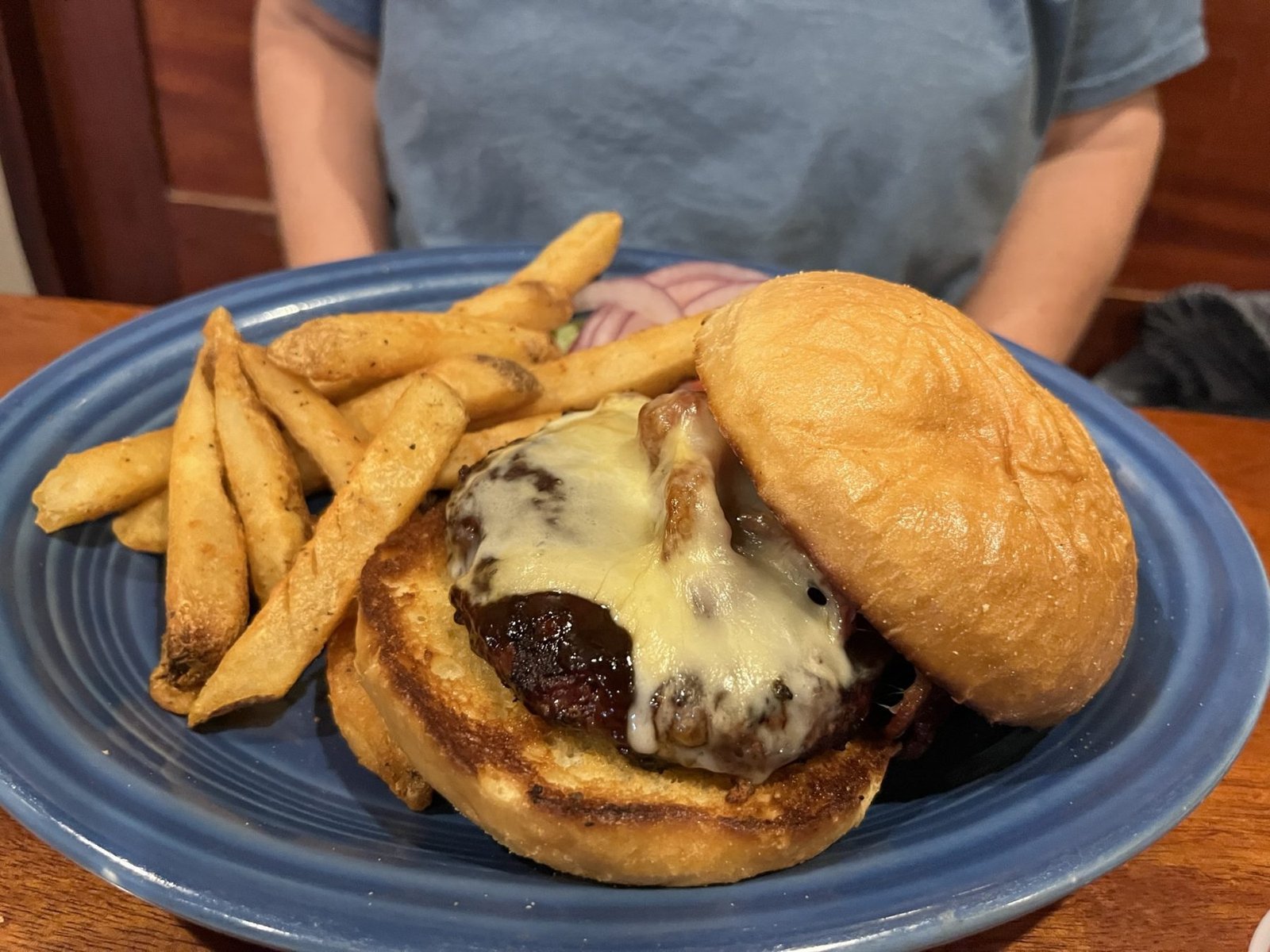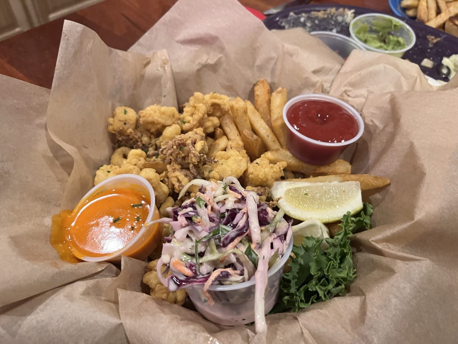 But Tina had her burger coming, and I went with the Calamari! The BBQ & Bacon Cheese Burger is a grilled burger topped with our homemade peach BBQ sauce, bacon, and cheddar cheese. The Calamari was a fried buffalo-style calamari with fries, cole slaw, and tartar sauce. (It had a killer buffalo sauce.) The meal was great, and our waitress, Alyse, made sure everything was perfect.