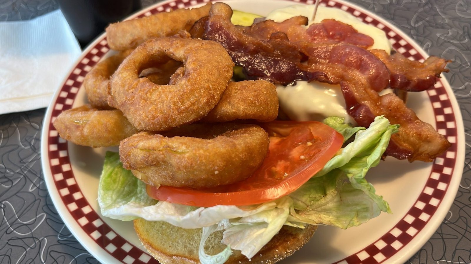And the lake? I love lakes. Lake George happens to be a few hours from me. One of the lakes I have visited for over 60 years. We went up to check out the home we rented for next September. Afterward, we headed to the Prospect Diner for burgers and onion rings. Medium rare, juicy, amazing burgers!