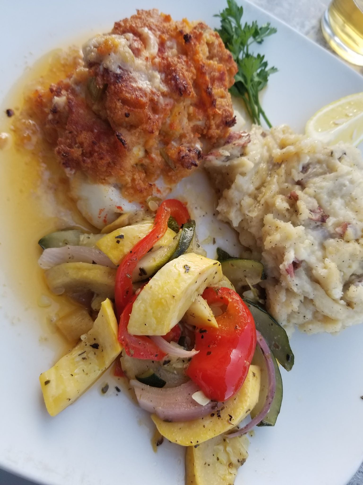 Ryan always seems to choose the most delicious items. However… On this trip, there were no complaints about my choice of entree. I had the Baked Stuffed Cod. which was a piece of fresh flakey cod, stuffed with homemade lump crabmeat stuffing and then baked. I had mine with mashed potatoes, salad, and grilled summer squash. YUM!!!
