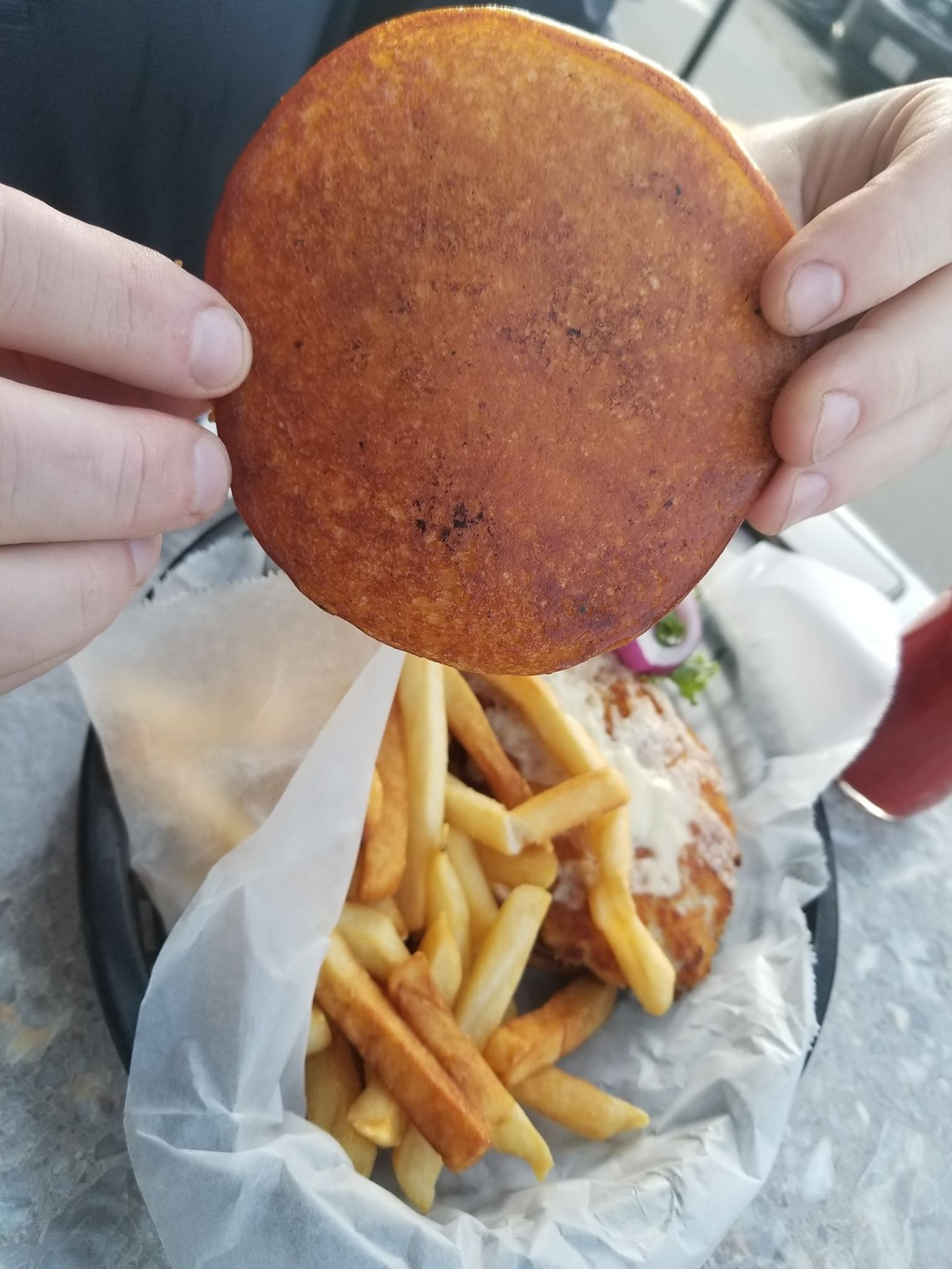I have always been a big fan of Pork Schnitzel, I mean you really can’t go wrong with fried pork. I have never had it with avocado before. The creaminess of the avocado gave this sandwich an extra special something. The flavors complement each other well. The way they grilled their bun, Ryan and I both have never seen a more perfect grilling job. The top was still in tacked and the bottom was grilled like a perfect griddlecake. YUM… YUM…
