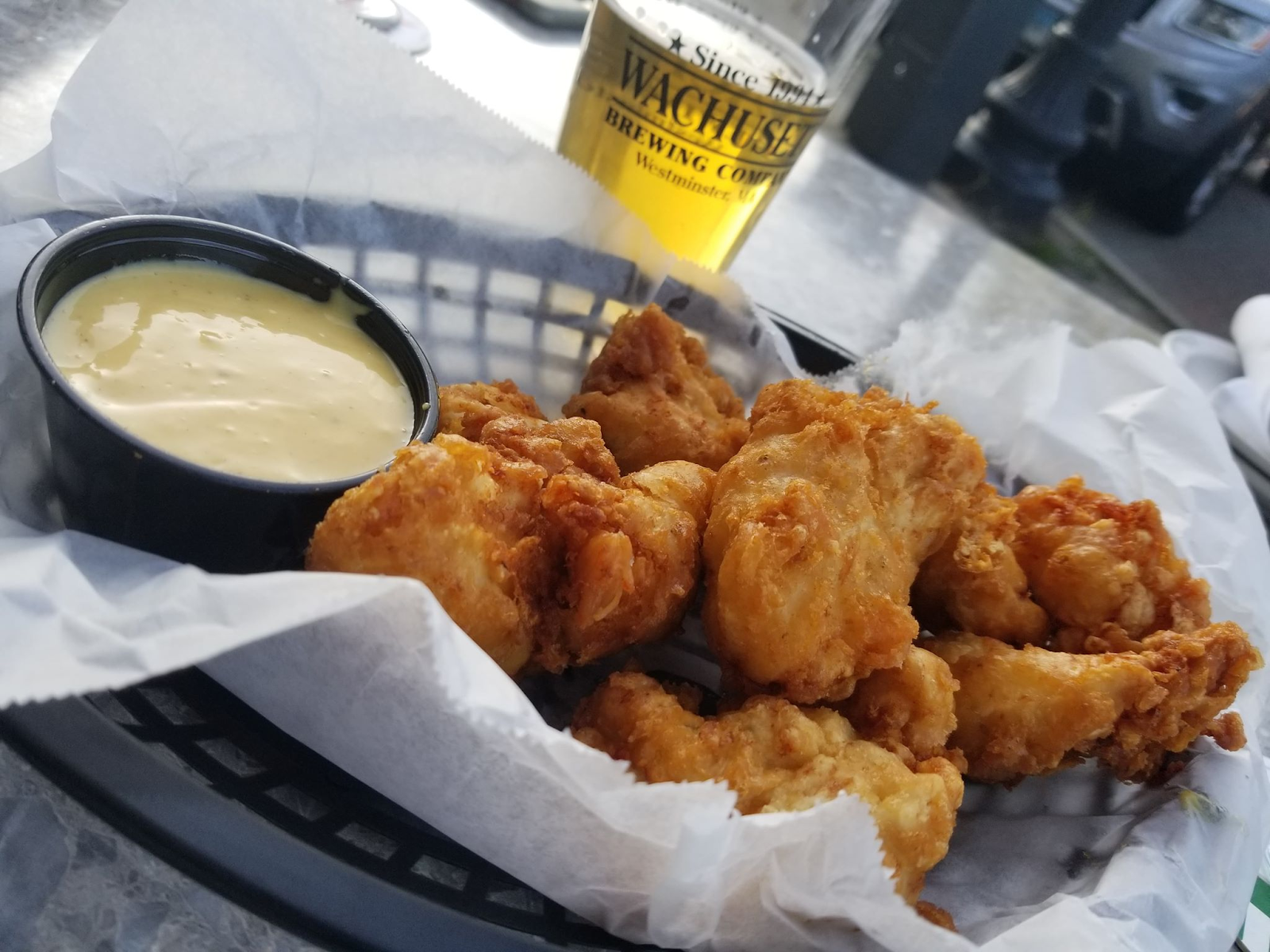Patrick’s Pub uses fresh ingredients and makes homemade comfort food. For two foodies such as my husband and I, we were excited to see the menu. We sat outside in front of the restaurant overlooking the beautiful common in the center of Pittsfield’s Main street. My husband was in the mood for some fried chicken. He immediately hunted the menu for some. He ordered us a basket of Beer Battered Chicken Chunks as an appetizer. When our basket of chicken arrived, we realized this place means business when it comes to food. The chicken was fresh, hand-breaded, tender, and juicy. When you pulled a piece apart you could see the steam escape into the air. The chicken was flakey and pulled apart smoothly. This was REAL fried chicken. What goes with Beer Battered Chicken Chunks?… A fresh cold craft brew. I ordered myself a glass of Wachusett Blueberry, Fruit Beer. Brewed by Wachusett Brewing Co. in Massachusetts. ABV: 4.5% IBU: 10.