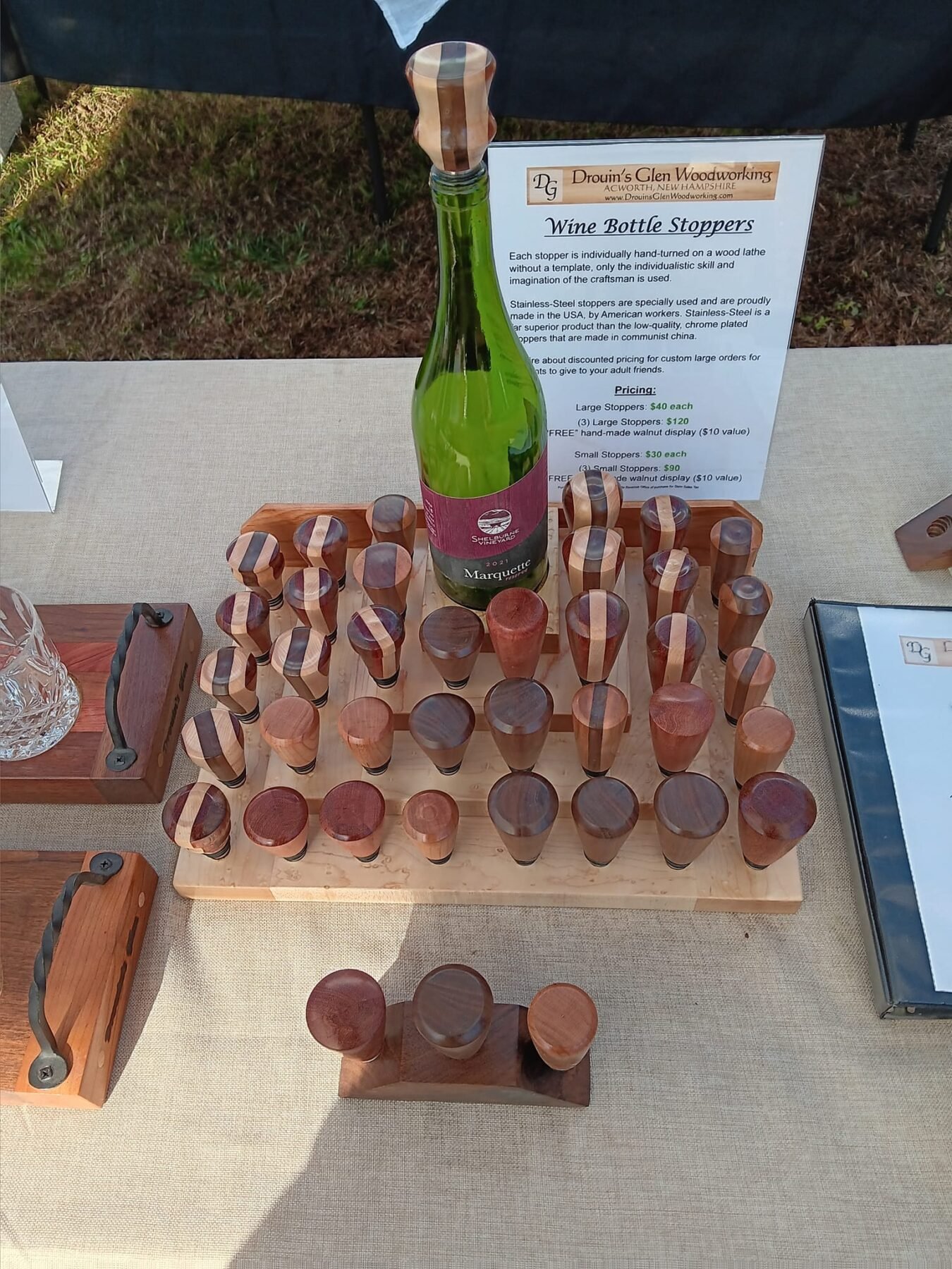 Let me say Phil’s work is exquisite. It is well thought out with usage in mind. He buys and uses USA-made products (Like those stainless steel pieces on the wine stoppers) and loves what he does.