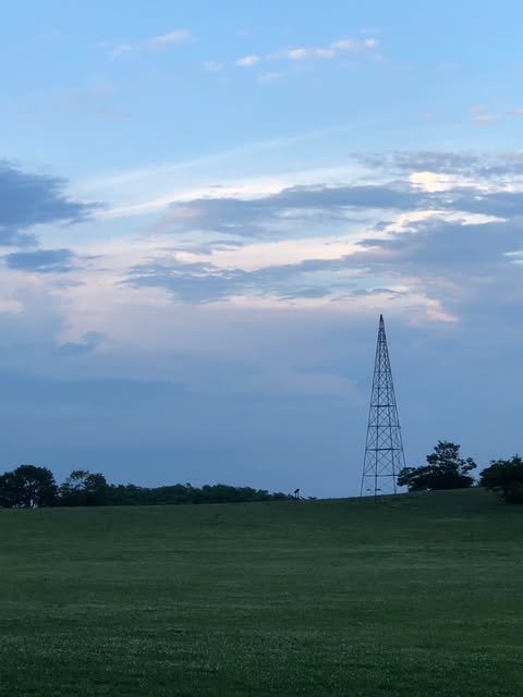 - Standing tall against the sunset sky is an old tower from the former amusement park, a reminder of yesterday.