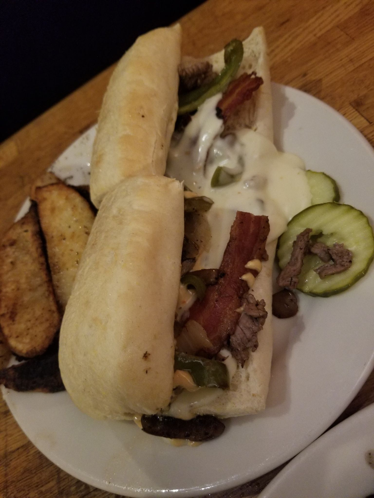 When we got inside, I noticed the large bar and the boards displaying the array of beers, specials and more. The menu contains what appears to be a European influence that met with the Mediterranean sea and a dash of Spanish flair. The food menu had many options that left my mouth watering. I had an extremely hard time selecting. I opted for one of their hand made maple chipotle sausages with a side of mashed sweet potatoes, black beans, and fermented green beans. YUMMY! The sausage was incredible. I settled on this, but It was a hard choice. For the first time in a long time, there were more options than I could eat instead of a HUGE list of what I can’t. They offer tofu wraps, salmon burgers, homemade black bean burgers, veggie bowls, sausage plates, pulled pork, chicken dishes, Mediterranean dishes and so much more. My meat and potato loving husband went for the cheese steak sandwich. In which I call death by cheese and meat. I can only really handle a nibble. Naturally, I had a bite. AMAZING! But… I enjoyed my handmade sausage 1000 times more. Which is nice because well normally I am very envious of my husband’s choices.