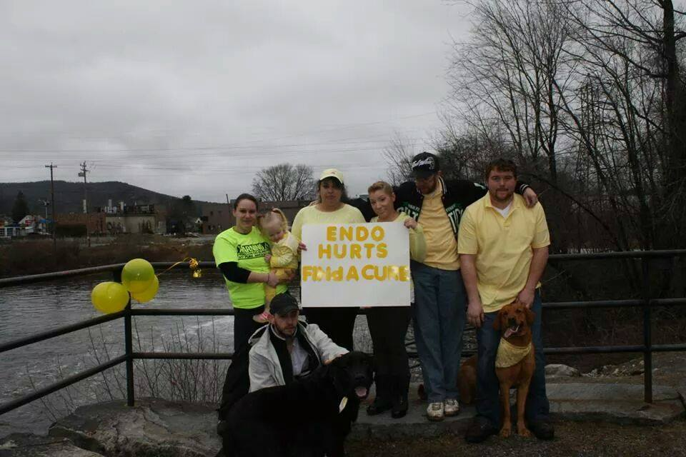 Suddenly I heard the word… END-O-ME-TRI-O-SIS. It was almost as if time stopped. I couldn’t believe my ears. There was someone on the TV speaking about this disease I had been living with for a decade. A disease that just cost me my financial security. A disease that had isolated me. Before that moment I thought I was alone in the world. I felt like I had failed my family. I thought I had done something wrong. Come to find out this disease is quite common. It affects 1 in 10 women worldwide. I certainly was not alone. These woman inspired me. They spoke of the disease and the importance of awareness. I heard her words and took them to heart. I was sick and tired of being sick! The next day, I posted on my Facebook page, that I was going to be in the park in Keene, NH at noon. I mentioned publicly for the 1st time what I had been struggling with. I asked friends to meet in the park to show support and awareness for the disease wearing yellow. I just posted it. Show up they did. Six of my friends showed up wearing yellow, last minute in support of my cause.