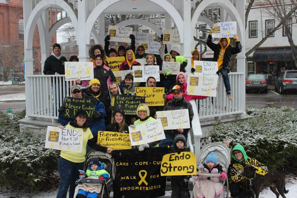 It felt good to have someone to confide in. It felt amazing to not feel alone anymore. This lead to the idea that she and I wanted to help more people like us. A year later we decided that if one post could bring us together, imagine what a news story could do. We contacted the local paper and asked them to share our story. We told the paper that we would be at that same park, at the same time on the one year anniversary of the photos in the park. It was a cold snowy March day, but one year later, 48 people showed up. 48 People that not only met in the park but marched Main Street in Keene, NH with us. One Newspaper article. After that, there was no going back to feeling sorry for myself. There was no way I could ever believe I was alone in this again. In fact, that was when I founded what is known as The Three C’s Foundation. Standing for Care, Cope, Cure. A support group for women struggling with Endometriosis. Which is now a Support group for ALL women related illnesses. We meet in Swanzey, NH once a month.
